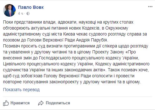 "Пока представители власти, адвокаты, ученые на круглых столах обсуждают актуальные вопросы новых Кодексов, в Окружном административном суде города Киева ждет судебного рассмотрения дело по иску к председателю Верховной Рады Андрею Парубию. Истец просит суд признать противоправными действия спикера относительно рассмотрения и принятия во втором чтении и в целом Проекта Закона "О внесении изменений в Хозяйственный процессуальный кодекс Украины, Гражданского процессуального кодекса Украины, Кодекса административного судопроизводства Украины и других законодательных актов. Также истец требует, чтобы суд обязал председателя Верховной Рады объявить и провести повторное голосование законопроекта во втором чтении и в целом", - пишет Вовк.