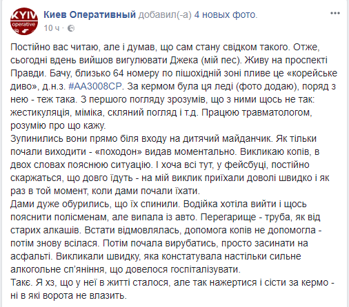 "Дамы очень возмутились, что их остановили. Водитель хотела выйти и что-то объяснить полисменам, но выпала из машины. Перегарище - труба, как от старых алкашей. Встать отказывалась, помощь копов не помогла - потом снова уселась. Потом начала вырубаться, просто засыпать на асфальте", - добавил свидетель инцидента.