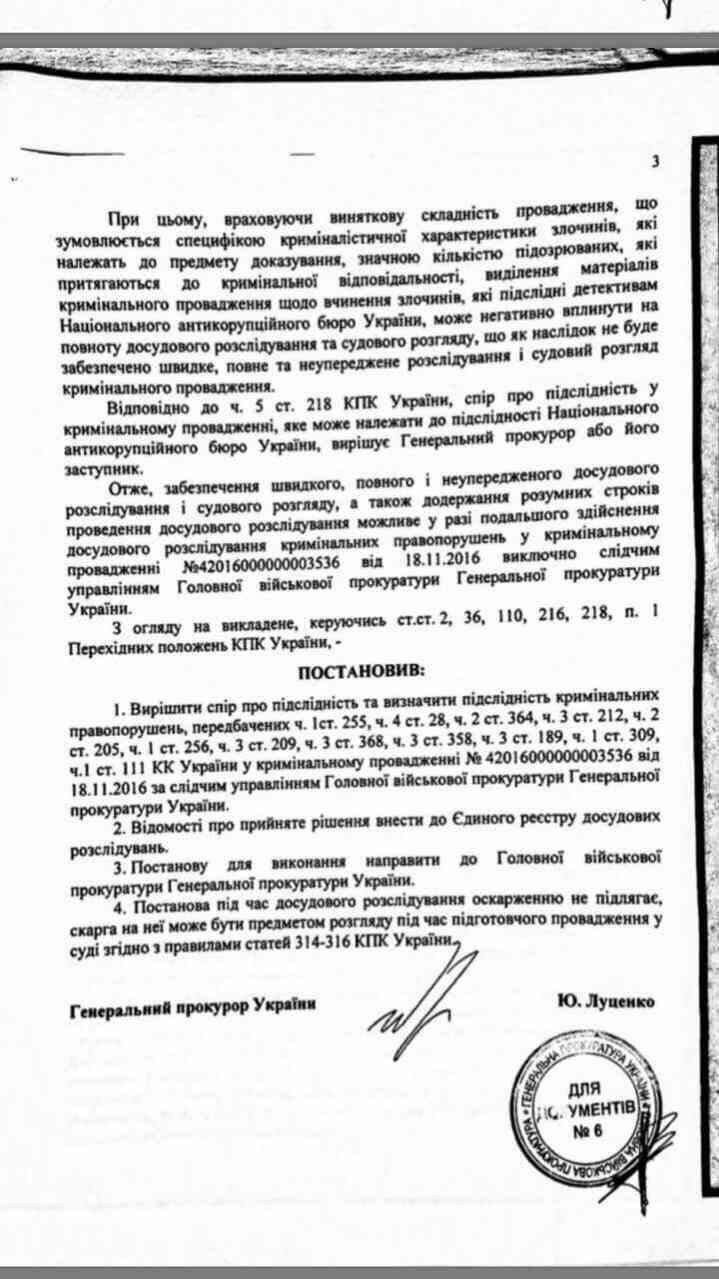 "Учитывая исключительную сложность производства,.. и значительное число подозреваемых, выделение материалов... детективам Национального антикоррупционного бюро Украины может негативно повлиять на полноту досудебного расследования и судебного рассмотрения", - говорится в постановлении Луценко.