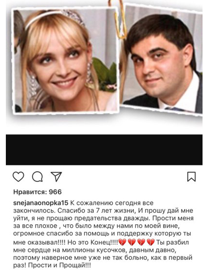 "Прости меня за все плохое, что было между нами по моей вине, огромное спасибо за помощь и поддержку которую ты мне оказывал !!! Но это конец !!! Ты разбил мне сердце на миллионы кусочков, давным-давно, поэтому, наверное, мне уже не так больно, как в первый раз! Прости и прощай! " - попрощалась с мужем топ-модель.