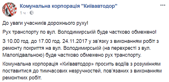 В пятницу, 24 ноября в Киеве частично ограничат движение транспорта по улице Владимирской. Ремонтные работы запланированы на пересечении улиц Владимирской и Малоподвальной. Об этом сообщает пресс-служба "Киевавтодора".