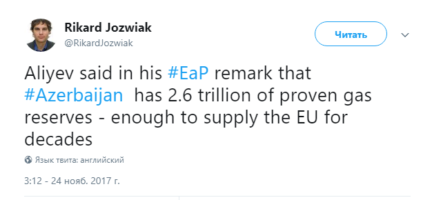 "Алиев заявил в своих комментариях на саммите "Восточного партнерства", что Азербайджан имеет 2,6 трлн кубометров разведанных запасов газа - достаточно, чтобы обеспечивать ЕС газом десятилетиями", - написал он.