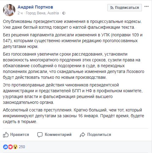 "Опубликованы президентские изменения в процессуальные кодексы. Уже даже беглый взгляд говорит о наглой фальсификации текста. Без решения парламента дописали изменения в УПК (поправки 109 и 547), которыми существенно изменили редакцию проголосованных депутатами норм. Без голосования увеличили сроки расследования, установили возможность многократного продления этих сроков, сузили права на обжалование сообщений о подозрении в суде, в переходных положениях дописали, что скандальные изменения депутата Лозового будут действовать только по новым производствам", - пишет Портнов.