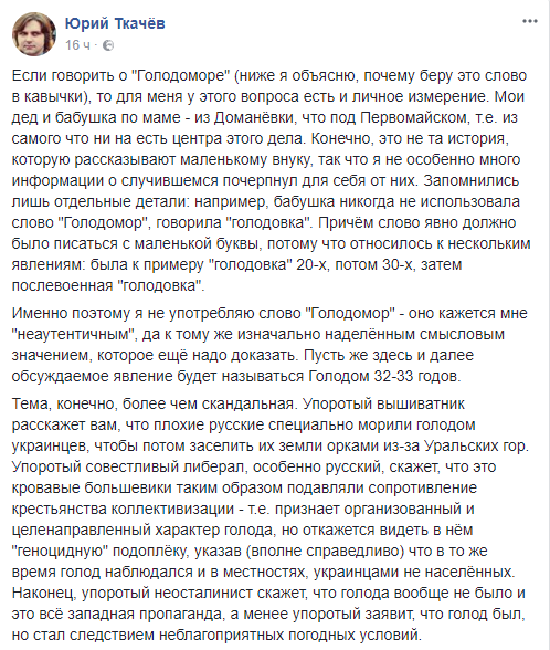 "Упоротый вышиватник расскажет вам, что плохие русские специально морили голодом украинцев, чтобы потом заселить их земли орками из-за Уральских гор. Упоротый совестливый либерал, особенно русский, скажет, что это кровавые большевики таким образом подавляли сопротивление крестьянства коллективизации - т.е. признает организованный и целенаправленный характер голода, но откажется видеть в нём "геноцидную" подоплеку, указав (вполне справедливо) что в то же время голод наблюдался и в местностях, украинцами не населенных. Наконец, упоротый неосталинист скажет, что голода вообще не было и это все западная пропаганда, а менее упоротый заявит, что голод был, но стал следствием неблагоприятных погодных условий…"