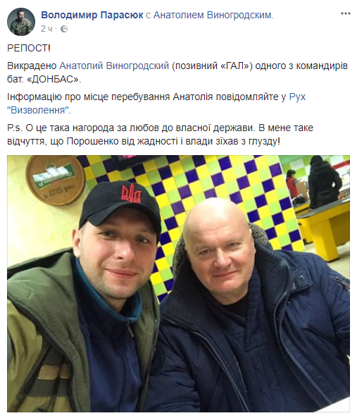 Нардеп Семен Семенченко написал, что Виногродского забрали люди в камуфляжной форме. Он также заявил, что предпринимаются меры по розыку комбата, и что лагерь добровольцев в Новгород-Волынском приведен в боевую готовность.