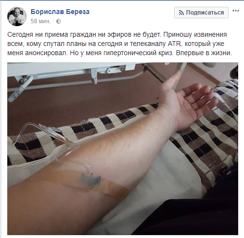 Народный депутат Борислав Береза попал в больницу с гипертоническим кризом. Об этом он рассказал в Facebook.