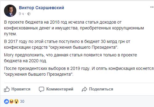 "В 2017 году по этой статье поступило в бюджет 30 млрд грн от конфискации средств "окружения бывшего президента". Могу предположить, что данная статья появится только в проекте бюджета на 2020 год. После президентских выборов в 2019 году. И опять конфискация коснется "окружения бывшего Президента", - отметил Скаршевский.