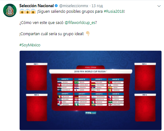 Нервы не выдержали у горячих мексиканцев, которые попали во вторую корзину ФИФА, и национальная сборная страны устроила свою жеребьевку, о чем и сообщила в официальном Twitter.
