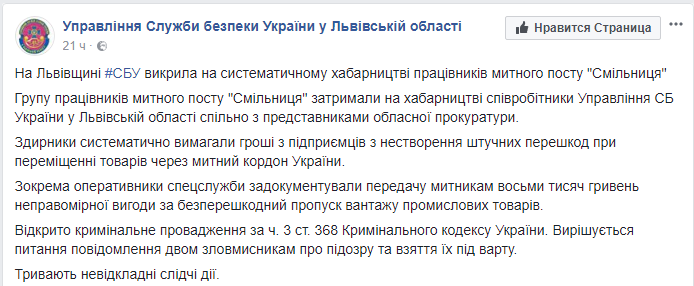 СБУ разоблачила группу таможенников с поста "Смильница" во Львовской области, которые систематически брали взятки. Об этом сообщает пресс-служба СБУ в Facebook.