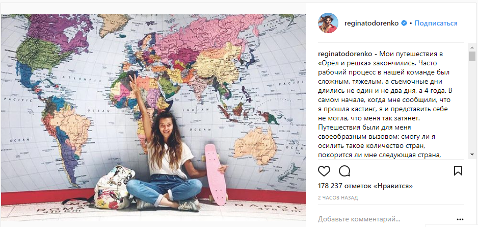 Популярная ведущая передачи "Орел и решка" Регина Тодоренко покидает проект спустя 4 года работы. Об этом она сообщила в Instagram.