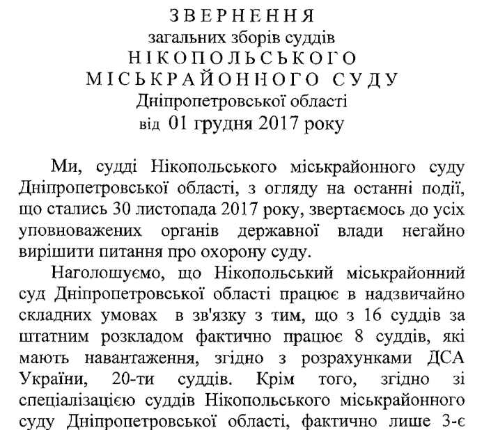 Из опубликованного текста стало известно, что вместо требующихся по штату 16 судей в Никопольском межрайонном суде на текущий момент работают всего 8. При этом нагрузка на них, в соответствии с расчетами Государственной судебной администрации (ДСА), соответствует нагрузке 20-х судей.