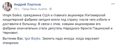 "Игоря Бойко, гражданина США и главного акционера Житомирской кондитерской фабрики сегодня взяли под стражу, после чего избили и доставили в больницу. В связи с этим, новыми акционерами его фабрики окончательно стали депутаты Народного Фронта Пашинский и Черновил. Вытянем Вас, Igor Boyko. Звонить надо иногда, когда окружают отморозки", - написал Портнов.
