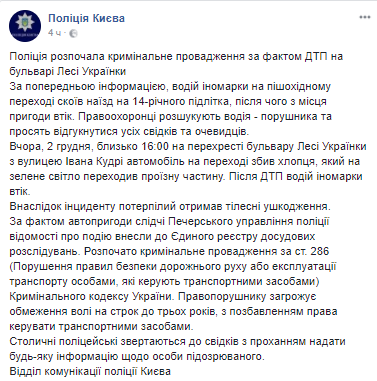 ДТП произошло 2 декабря, около 16.00 на пересечении бульвара Леси Украинки с улицей Ивана Кудри. Автомобиль сбил парня на переходе, когда горел зеленый свет для пешеходов.