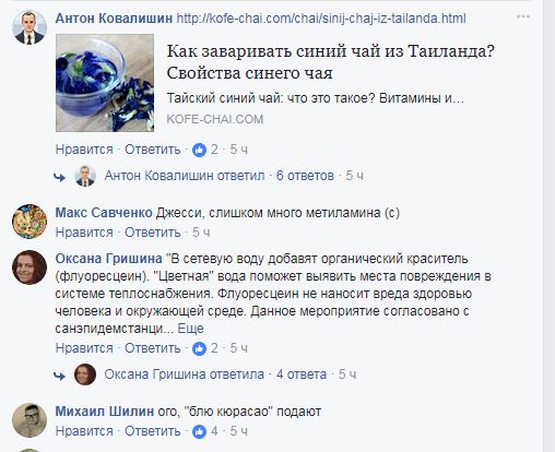 В комментариях пользователи не оставили без шуток странный цвет воды. Были высказаны предположения, что "Киевводоканал" решил побаловать жителей столицы ликером "блю кюрасао", или же временно запустил в сеть стоматологический ополаскиватель для полости рта - для здоровья зубов. Или предполагали, что это такой особый синий чай из Таиланда, просто немного разбавленный.