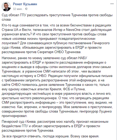 Бывший первый заместитель генерального прокурора Украины Ренат Кузьмин заявил, что Печерский суд Киева обязал ГПУ расследовать преступление секретаря СНБО Александра Турчинова против свободы слова. Об этом он написал в Facebook.
