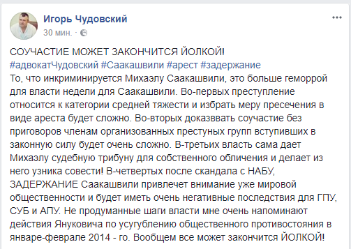 Еще один юрист - адвокат Игорь Чудовский прокомментировал в Facebook вменяемую задержанному политику статью о содействии участникам преступных организаций и сокрытие их преступной деятельности - ч. 1 ст. 256.
