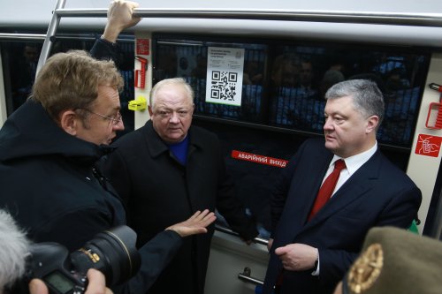 Президент Украины Петр Порошенко, мэр Львова Андрей Садовый и председатель правления концерна "Электрон" Юрий Бубес совершили совместную поездку на первом и пока единственном в Украине общественном электробусе. Об этом сообщает Zik.