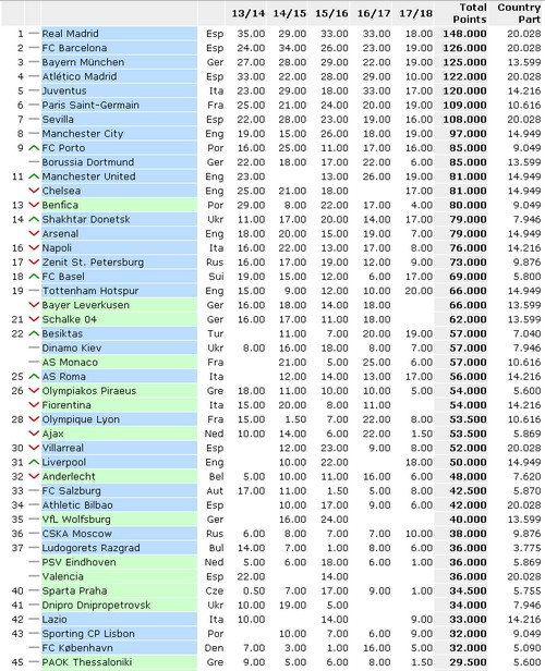 Далее из украинских клубов идут "Днепр" на 41 позиции с 34 очками, "Заря" и "Черноморец" с девятью очками делят 131-ю строчку. У "Александрии", "Ворсклы", "Металлиста", "Олимпика" и "Металлурга" личный рейтинг ниже украинского, который составляет 7,946 балла и они делят 141-145 места в таблице.