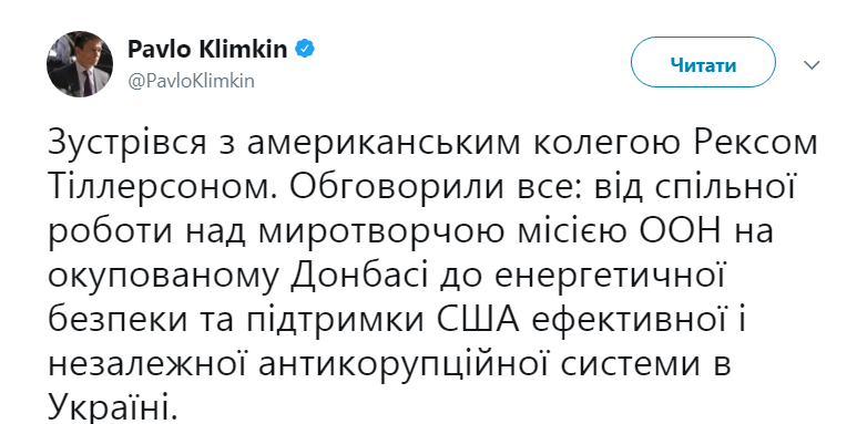 "Встретился с американским коллегой Рексом Тиллерсоном. Обсудили всё: от совместной работы над миротворческой миссией ООН в оккупированном Донбассе до энергетической безопасности и поддержки США эффективной и независимой антикоррупционной системы в Украине", - написал в Twitter-микроблоге Климкин.