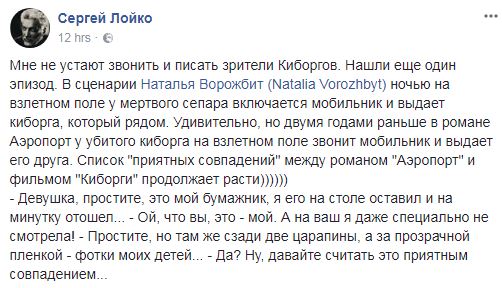 "В сценарии Натальи Ворожбит (Natalia Vorozhbyt) ночью на взлетном поле у мертвого сепара включается мобильник и выдает киборга, который рядом. Удивительно, но двумя годами раньше в романе Аэропорт у убитого киборга на взлетном поле звонит мобильник и выдает его друга. Список "приятных совпадений" между романом "Аэропорт" и фильмом "Киборги" продолжает расти", - написал он.