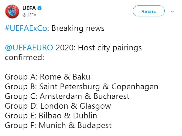 Напомним, в честь 60-летия чемпионата Европы УЕФА проведет ЕВРО-2020 в 12 городах по всему континенту - от Баку и Санкт-Петербурга до Лондона и Бильбао.