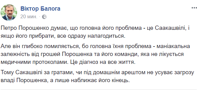 14:06  "Сакашвили за решеткой или под домашним арестом не устраняет угрозу власти Порошенко, а лишь приближает его конец", - пишет в Facebook нардеп Виктор Балога, комментируя марш за импичмент.