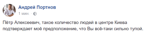 "Пётр Алексеевич, такое количество людей в центре Киева подтверждает моё предположение, что Вы всё-таки сильно тупой", - пишет юрист Андрей Портнов в Facebook.
