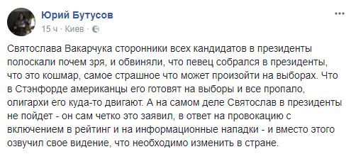 "Святослава Вакарчука сторонники всех кандидатов в президенты полоскали почем зря, и обвиняли, что певец собрался в президенты, что это кошмар, самое страшное что может произойти на выборах. Что в Стэнфорде американцы его готовят на выборы и все пропало, олигархи его куда-то двигают. А на самом деле Святослав в президенты не пойдет - он сам четко это заявил, в ответ на провокацию с включением в рейтинг и на информационные нападки - и вместо этого озвучил свое видение, что необходимо изменить в стране".