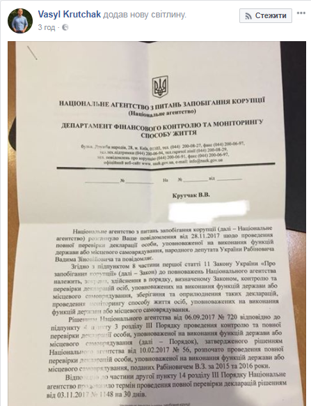 "По решению Национального агентства от 06.09.2017 №720 в соответствии с подпунктом 4 пункта 3 раздела ІІІ Порядка проведения контроля и полной проверки декларации лица, уполномоченного на выполнение функций государства или местного самоуправления, утвержденного решением Национального агентства  от 10.02.2017 №56, начато проведение полной проверки декларации лица, уполномоченного на выполнение функций государства или местного самоуправления, поданных Рабиновичем В. З. за 2015 и 2016 года.", - идет речь в ответе НАПК на запрос журналиста.