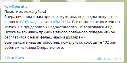 В Киеве аферист приобрел автомобиль Volkswagen на госномерах WRA21014 за фальшивые доллары. Об этом сообщили обманутые продавцы через портал KyivOperativ в Telegram.