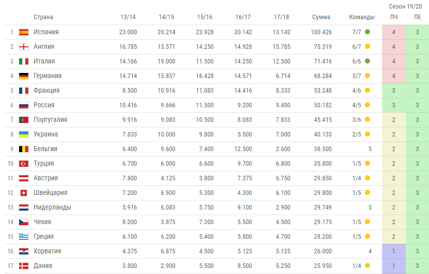Общий рейтинг страны определяется как сумма коэффициентов страны за последние 5 сезонов. В графе "Команды" указано количество клубов - стартовавших и оставшихся на текущий момент в еврокубках. Если от страны выбыли все клубы - указано только количество стартовавших. Зеленым цветом выделены страны, которые сохранили всех своих представителей в текущем сезоне, желтый индикатор означает частичное представительство страны. Итоговое место в этом рейтинге определяет представительство страны в еврокубках спустя 1 сезон (последние две графы таблицы).
