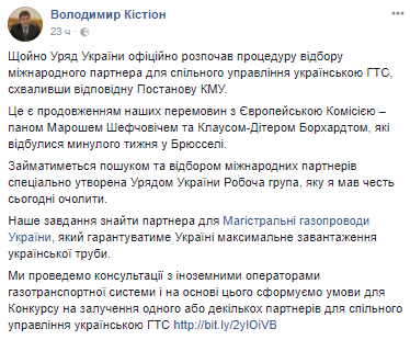 По его словам, это решение принято по итогам недавней встречи представителей правительства Украины и Европейской комиссии. "Это является продолжением наших переговоров с Европейской Комиссией - вице-президентом Еврокомиссии Марошем Шефчовичем и Клаусом-Дитером Борхардтом (директор отдела по внутреннему рынку ЕС генерального директората по энергетике ЕК), состоявшихся на прошлой неделе в Брюсселе. Заниматься поиском и отбором международных партнеров будет специально созданная правительством Украины рабочая группа, которую я имел честь сегодня возглавить. Наша задача найти партнера для "Магистральных газопроводов Украины", который будет гарантировать максимальную загрузку украинской трубы. Мы проведем консультации с иностранными операторами газотранспортной системы и на основе этого сформируем условия для конкурса на привлечение одного или нескольких партнеров для совместного управления украинской ГТС", - написал Кистион на своей странице в Facebook.