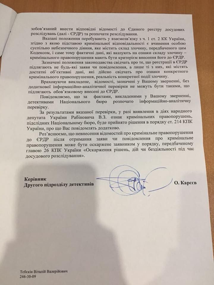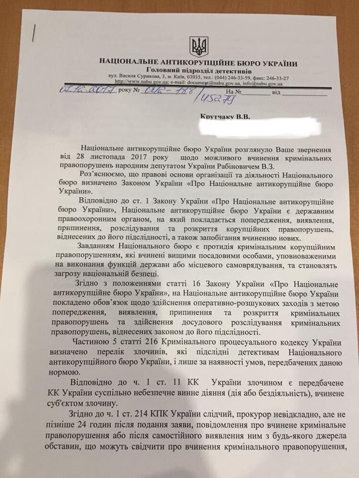 "Хоп! И вторая ласточка прилетела к Вадиму (Давиду) Рабиновичу. По моему обращению НАБУ проведет информационно-аналитическую проверку", - написал Крутчак.