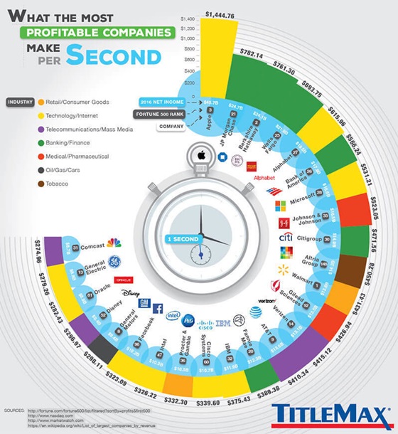 Доход компании Apple за 1 секунду составляет примерно $1444 доллара. По этому показателю "яблочный гигант" опередил все остальные публичные коммерческие компании мира. Соответствующие результаты недавно проведенного исследования опубликовала компания TitleMax.