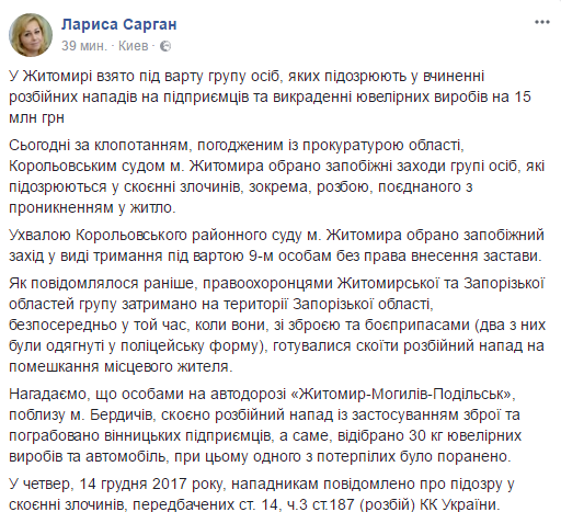 Королевский районный суд Житомира избрал меру пресечения в виде содержания под стражей группе лиц, подозреваемых в совершении преступлений, в частности, разбое, соединенном с проникновением в жилище, а также похищении ювелирных изделий на 15 млн грн (30 килограммов), сообщает пресс-секретарь генпрокурора Украины Лариса Сарган.