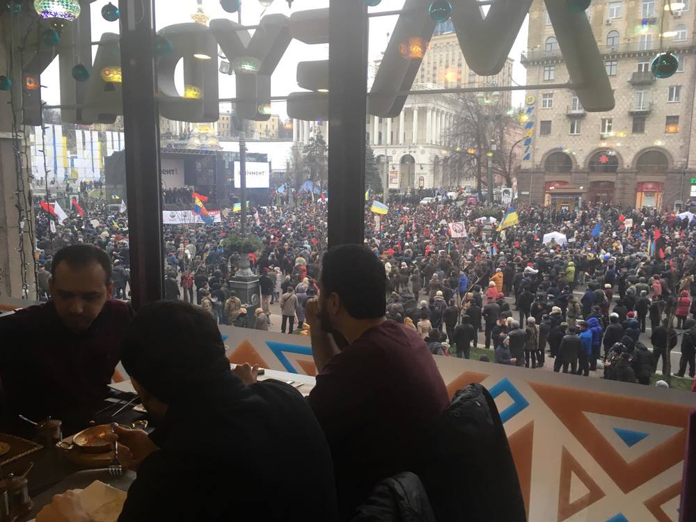 14:09  МихоМайдан из окна столичного ресторана. Столики у окна пользуются спросом - такое не каждый день увидишь. Фото "Страны".