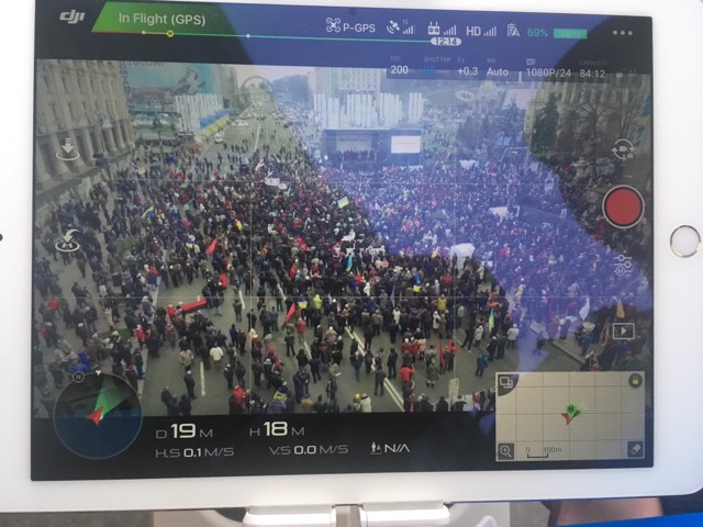 13:54  МихоМайдан в центре Киева сейчас. Вот так это выглядит с планшета, который управляет квадрокоптером.