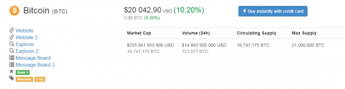 Стоимость одной монеты Bitcoin "пробила" очередной рекорд и достигла отметки в $20 тысяч. Об этом свидетельствуют данные биржи coinmarketcap.com.