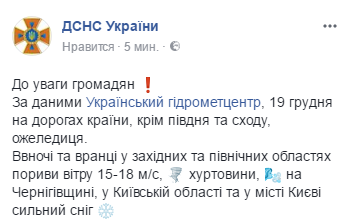 "19 декабря на дорогах страны, кроме юга и востока, гололедица. "Ночью и утром в западных и северных областях порывы ветра 15-18 м / с, метели, на Черниговщине, в Киевской области и в городе Киеве сильный снег".