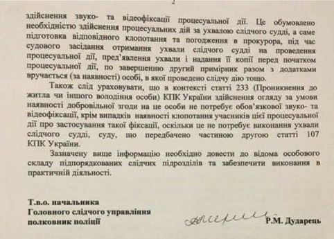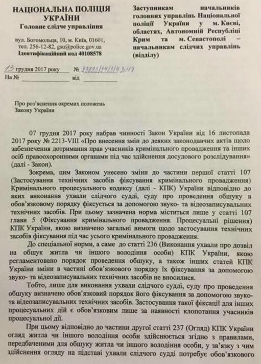 В нем "большие полицейские умы" решили истолковать изменения УПК на свой лад и прописали, что применять видеаппаратуру при обысках обязательно, только если на этом будет настаивать одна из сторон. В ином случае писать видео якобы совсем не обязательно. То же самое касается и проникновения в жилье (обыск в порядке ст.233 УПК без определения суда, который согласовывает прокурор).