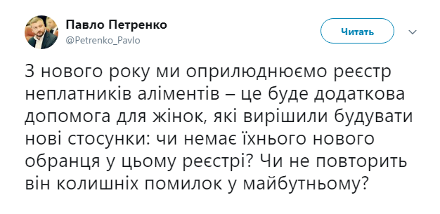 С 2018 года в Украине появится публичный реестр неплательщиков алиментов. Об этом сообщил министр юстиции Павел Петренко в Twitter.