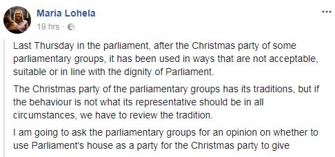 Спикер парламента Финляндии Мария Лохела предложила отменить все рождественские вечеринки в высшем законодательном органе страны.