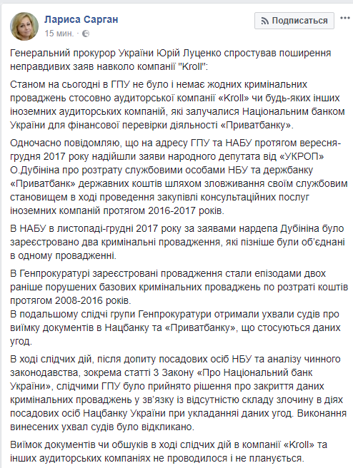 "На сегодня в ГПУ не было и нет никаких уголовных производств в отношении аудиторской компании "Kroll" или любых других иностранных аудиторских компаний, которые привлекались Национальным банком Украины для финансовой проверки деятельности "Приватбанка", - заявил Луценко устами своего спикера.