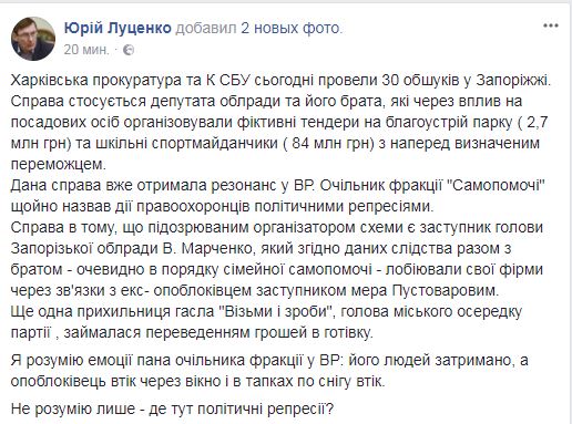 "В тапках по снегу убежал". Луценко рассказал подробности масштабных обысков в Запорожском облсовете