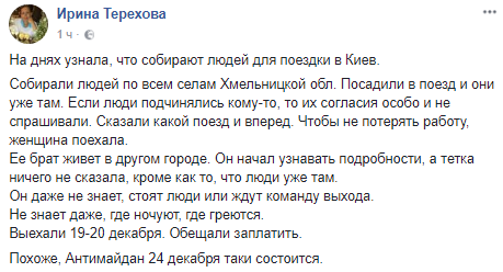 "На днях узнала, что собирают людей для поездки в Киев. Собирали людей по всем селам Хмельницкой обл. Посадили в поезд и они уже там. Если люди подчинялись кому-то, то их согласия особо и не спрашивали. Сказали какой поезд и вперед. Чтобы не потерять работу, женщина поехала. Ее брат живет в другом городе. Он начал узнавать подробности, а тетка ничего не сказала, кроме как то, что люди уже там. Он даже не знает, стоят люди или ждут команду выхода", - написала она.