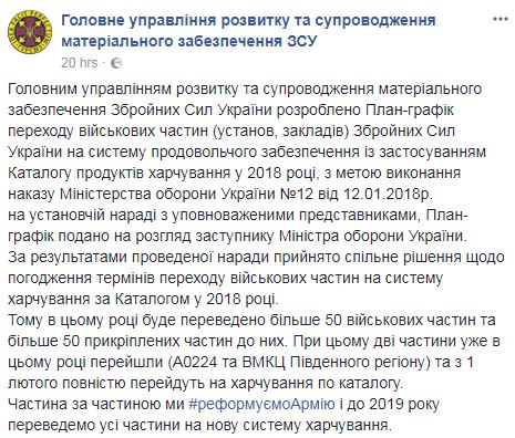 Разработан план-график перехода воинских частей (учреждений, заведений) на систему продовольственного обеспечения с использованием каталога продуктов питания, в соответствии с приказом №12 Министерства обороны украины от 12 января 2018 года.