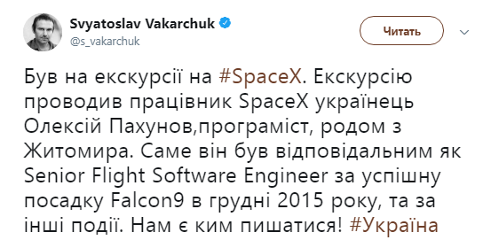 "Был на экскурсии на SpaceX. Экскурсию проводил работник SpaceX украинец Алексей Пахунов, программист, родом из Житомира. Именно он был ответственным как Senior Flight Software Engineer за успешную посадку Falcon 9 в декабре 2015 года, и других событиях. Нам есть кем гордиться, Украина", - написал Вакарчук и добавил, что жена Алексея преподает украинский язык в украинской школе в Лос-Анджелесе.