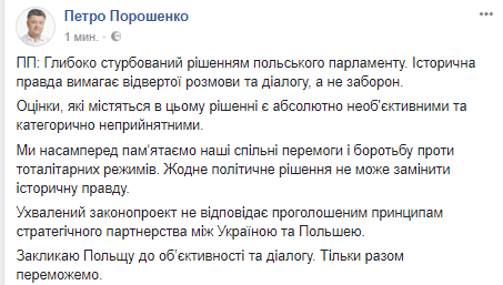 Принятый законопроект не соответствует провозглашенным принципам стратегического партнерства между Украиной и Польшей. Призываю Польшу к объективности и диалога. Только вместе победим", - говорится в сообщении.