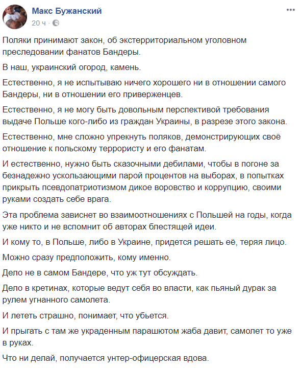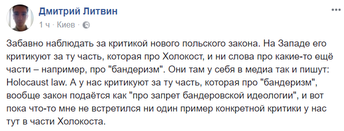 "Забавно наблюдать за критикой нового польского закона. На Западе его критикуют за ту часть, которая про Холокост, и ни слова про какие-то еще части – например, про "бандеризм". Они там у себя в медиа так и пишут: Holocaust law. А у нас критикуют за ту часть, которая про "бандеризм", вообще закон подается как "про запрет бандеровской идеологии", и вот пока что-то мне не встретился ни один пример конкретной критики у нас тут в части Холокоста", – пишет журналист Дмитрий Литвин.