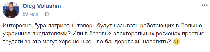 "Интересно, "ура-патриоты" теперь будут называть работающих в Польше украинцев предателями? Или в базовых электоральных регионах простые трудяги за это могут хорошенько, "по-бандеровски", навалять?", – задается вопросом политолог Олег Волошин.
